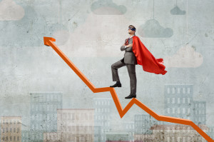Young man in super hero costume standing on increasing graph