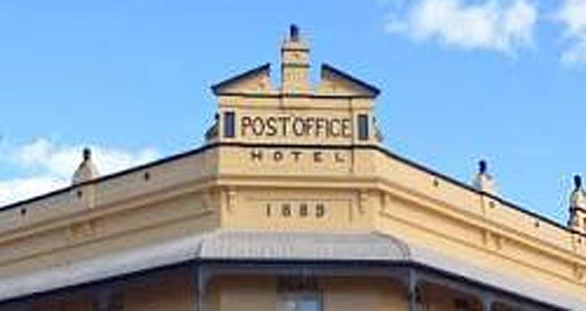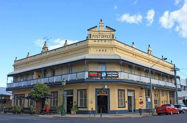 The two-storey Post Office Hotel was built in 1889, sporting a Georgian parapet and second floor wrap-around balcony, on an arterial corner in Maryborough.