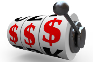 Three dollar signs lines up for a jackpot on 3 slot machine wheels, symbolizing a jackpot of wealth, money, riches