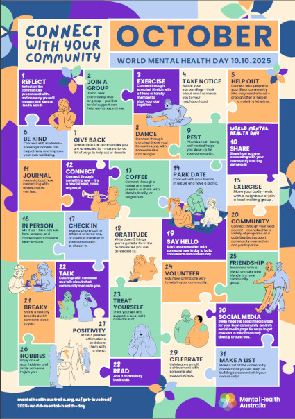 This year, Mental Health Australia’s theme is ‘Connect with your community’, and offers free resources to help promote the day.